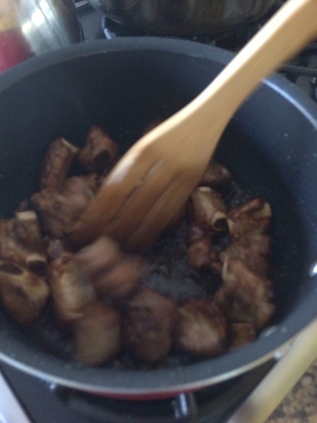 步骤2 排骨爆炒到微黄,加老抽,冰糖,八角1,草果1,辣椒2个,加水多一些,漫过排骨