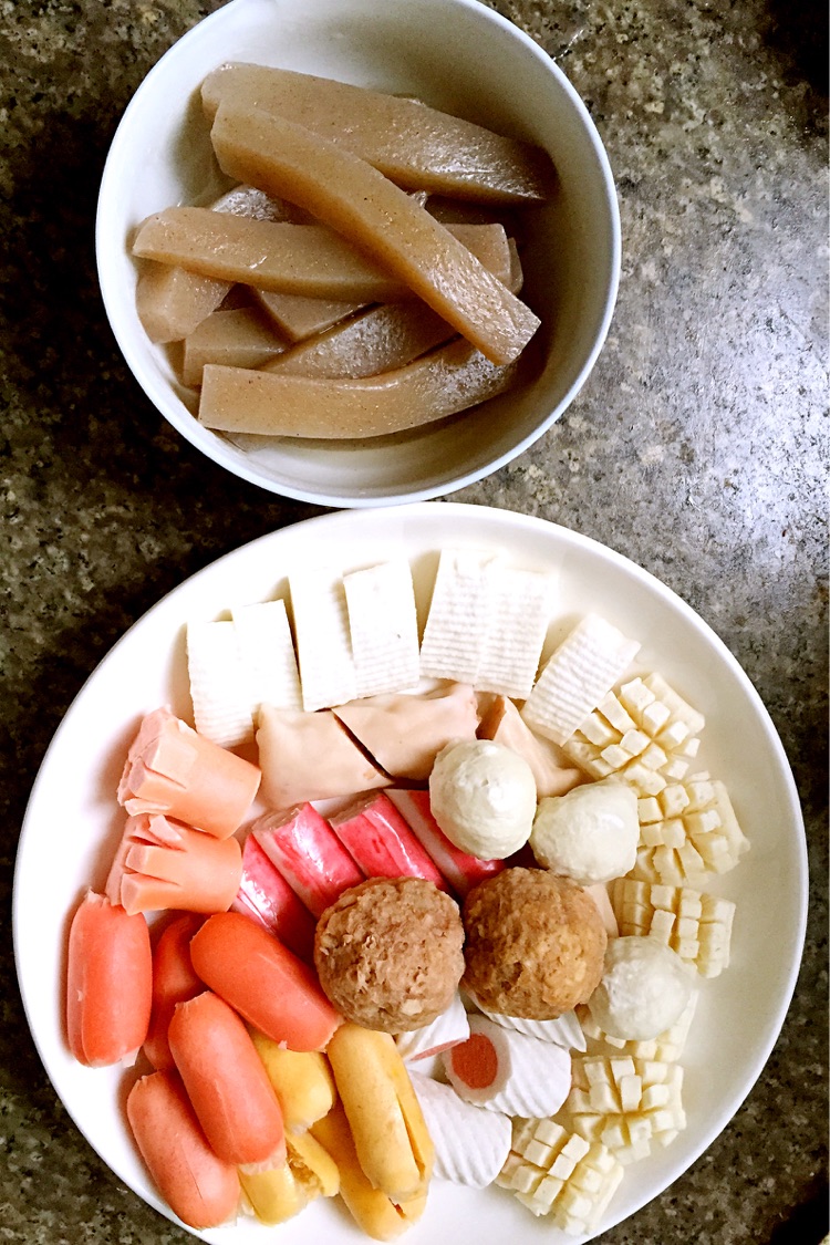 步骤1 魔芋煮至7分熟,火腿鱼排等等用油炸至7分熟