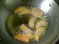 步骤5 油烧到八成热就可以一片片放入红薯片