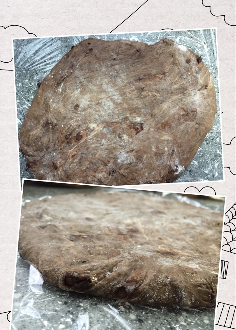 步骤4 发酵完成后放入提前撒了面粉的保鲜膜上。手上沾上面粉把面糊压成厚度约5厘米的面饼。