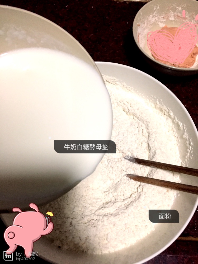 步骤2 牛奶加热融化酵母白糖以及盐,徐徐倒入面粉搅拌至成型可搓