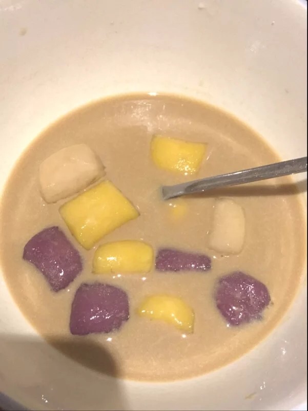 步骤2 芋圆放到一起煮好,过凉水,开锅放芋圆飘上来两分钟关火放凉水里会更有嚼劲