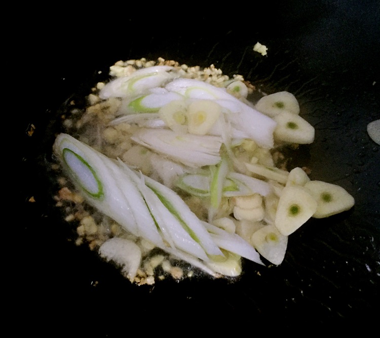 锅中倒入底油中火放入姜、葱、蒜爆香