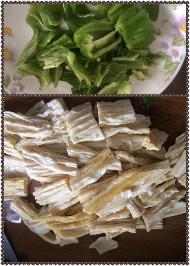步骤1 把腐竹泡软后切段,青椒洗净后切片状