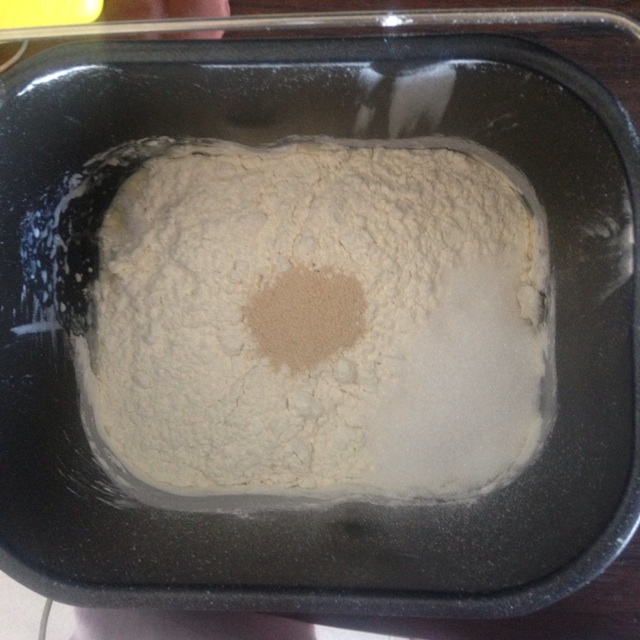 步骤3 先倒入南瓜泥,鸡蛋,再倒入面粉,糖放边角,酵母放中间,启动揉面程序15分钟揉面就好