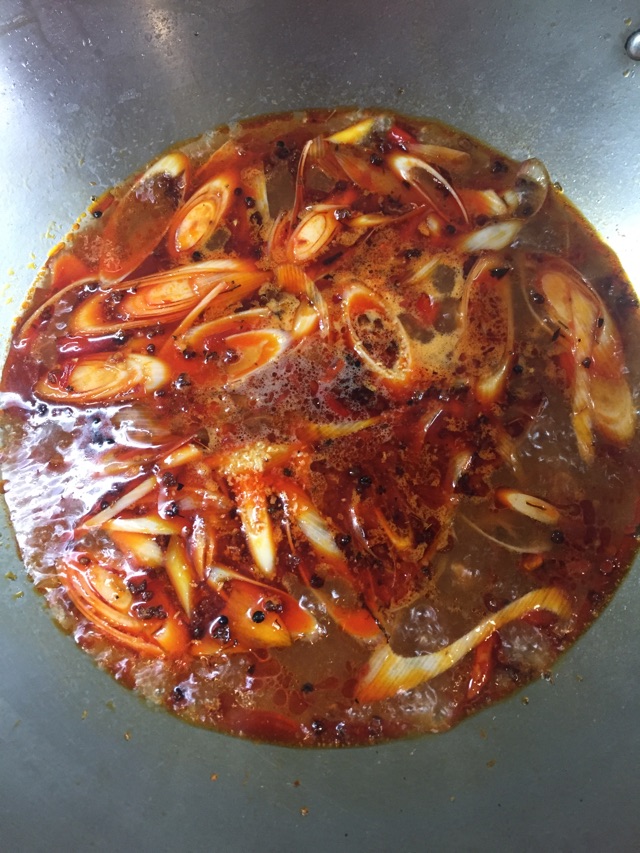 步骤8 花椒辣椒爆出香味放豆瓣酱(一定要用郫县豆瓣)爆出红油
