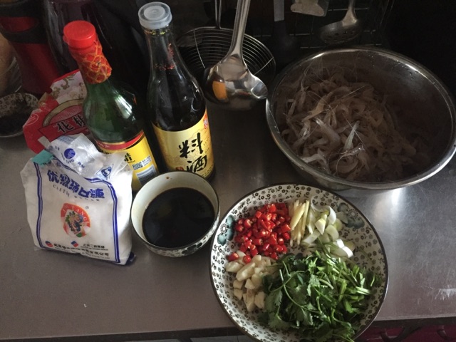 步骤5 倒入陈醋适量,料酒适量,放入花椒,搅拌均匀。步骤6 放入葱段,姜丝,辣椒段,香菜等,搅拌均匀。