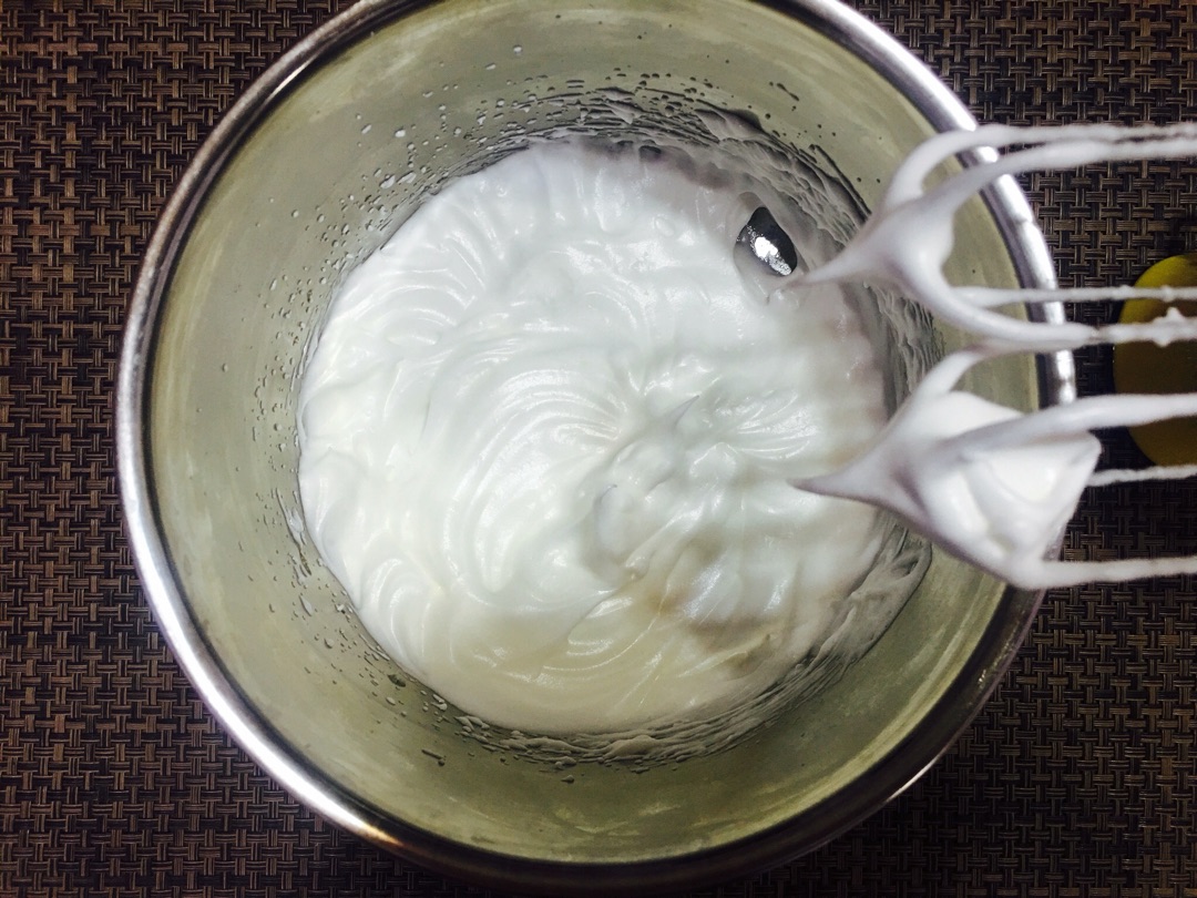 步骤2 蛋白中分3次加入20g的砂糖,打发蛋白至干性发泡。ps打发蛋白的方法:打发蛋白,最好用电动打蛋器。步骤:1)在蛋白中滴入几滴柠檬汁或者白醋。2)打到有粗泡的时候第一次加糖,大概1/3。3)蛋白开始细腻时第二次加糖,大概总量的1/3。4)蛋白非常细腻开始有弯钩,加入余下的糖,继续打。5)打发至感觉有阻力,提起打蛋器蛋白形成的尖峰不倒,盆子倾斜时蛋白不流动,倒扣蛋白不会被倒出。即打发成功。