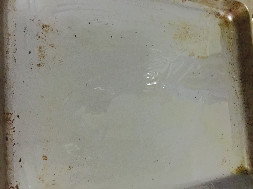 步骤8 将凝固的蛋皮用铲子、筷子辅助卷起来堆在烤盘一侧。